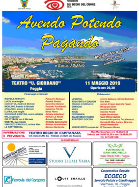 Si è tenuto presso il Teatro Giordano in Foggia, l’11 maggio 2019, lo Spettacolo Teatrale di solidarietà a favore della nostra Fondazione, AVENDO, POTENDO, PAGANDO , una brillante commedia di Nino Taranto, messa in scena dalla OFFICINA TEATRALE DI CANDELA. Nutrita la partecipazione degli Spettatori ed ottima l’interpretazione degli Attori : una serata davvero piacevole , trascorsa insieme !